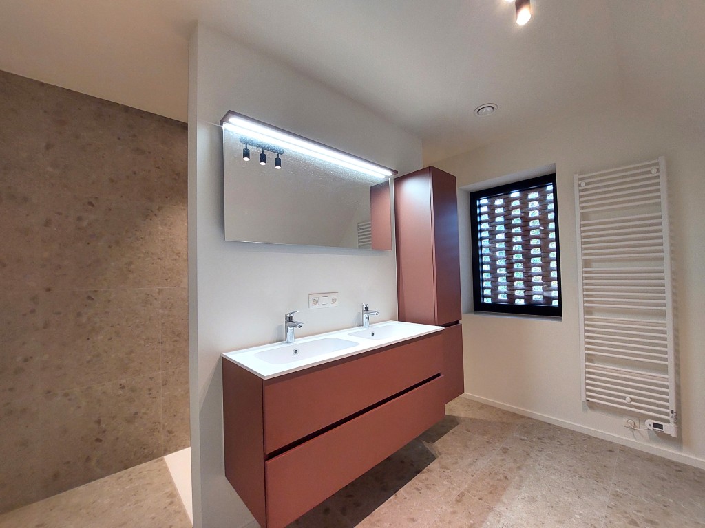 Dankzij de slimme indeling geniet je op het gelijkvloers verder van een handige wasplaats, een apart toilet en een overdekte carport. Op de bovenverdieping bevinden zich drie volwaardige slaapkamers (18, 17 en 16 m²), een stijlvolle badkamer met ligbad en inloopdouche, en een tweede toilet – perfect voor wie comfort en ruimte belangrijk vindt. Tenslotte is er nog een praktische zolderberging.